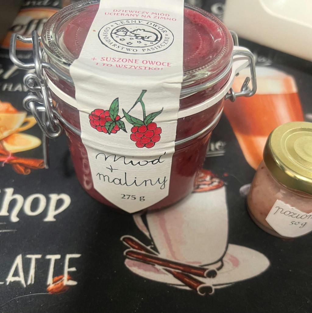 Produkt naturalny. Kolor miodu może nieznacznie różnić się od koloru ze zdjęcia. Ze względu na swój naturalny charakter, miód z malinami może z czasem zmienić kolor i smak. To prawidłowe zjawisko.